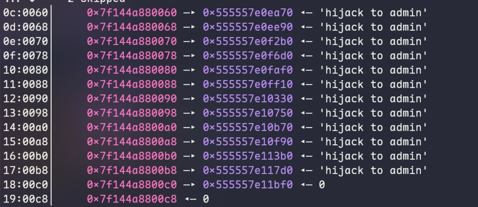 CLEAR_TEXT(f"Admin pointer successfully overwritten via user {id}")