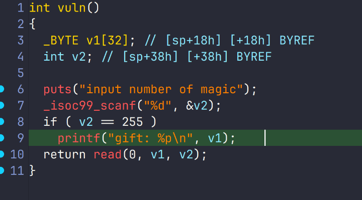 给出一个v1的地址,可以栈溢出