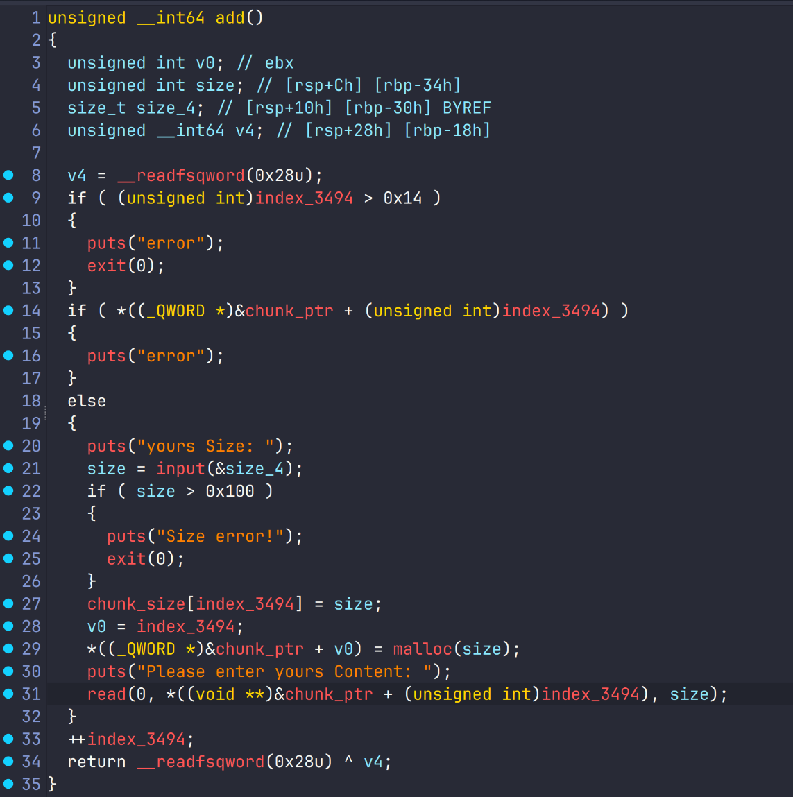 由于实现了一个stack,在这片空间上我们可以利用操作符进行溢出,但是只能输入一次,要精心构建payload,如果我们++两次,那么就会直接触发到canary从而stack smashed
