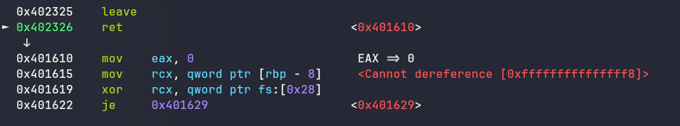 而pop部分始终会执行–的操作,即使检查无法通过也不会报错,这就导致可以正常返回,从而覆盖到栈上的信息,而在进入函数之前刚好就是0,所以我们直接输入+的话,就会如下图