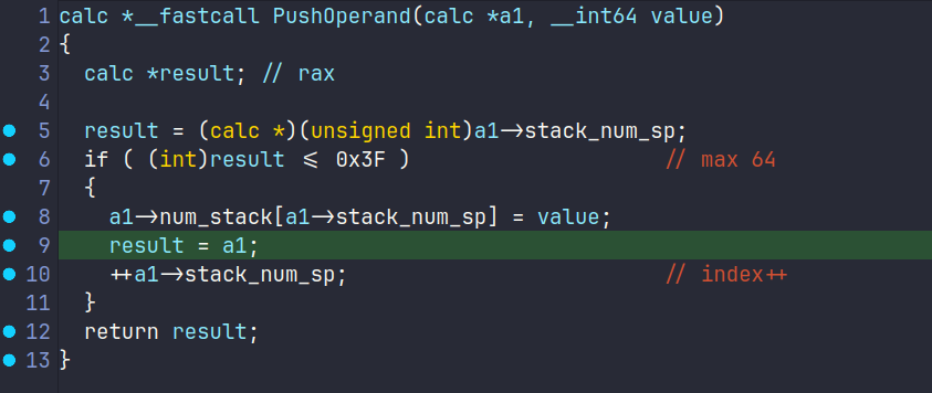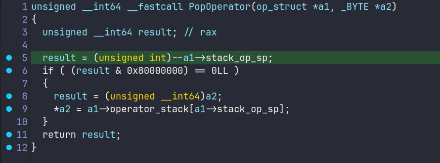 如果输入一个+的情况下会因为多清理一次栈而导致变为0从而指向0-8,这时候需要回去看具体的逻辑才可以。难受的是符号全剥去了,不过好在结构体还比较好逆,实际上程序模拟实现了两个栈,分别装载操作数和操作符