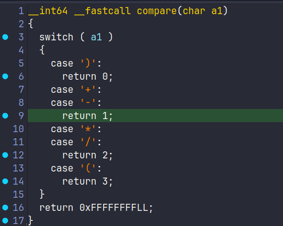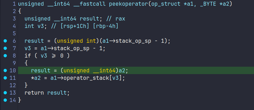 遇到)的时候,实际上陷入到了while(1)循环当中,v11由上一次的Peek得到,若为(则会继续走pop分支
