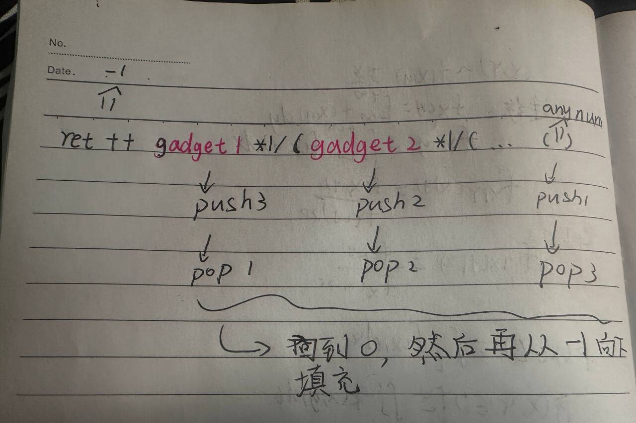 按照逻辑,直到遇到之前的++我们的while都不会退出,伴随着(我们的地址进入栈中,但注意此时还是没有覆盖到返回地址的,准备好之后最后再执行到ret++的部分,此时不就实现了-1开始的链条覆盖了吗?