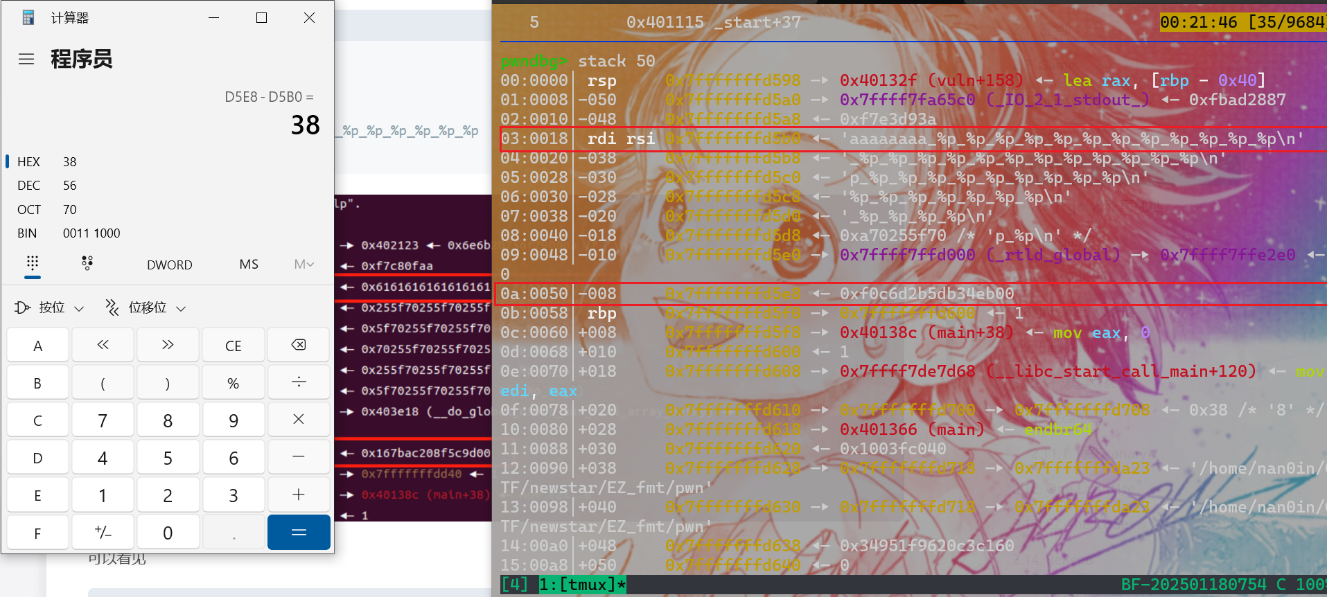 main中有gift和vuln函数gift函数可输入6个字节gdb开调,canary再rbp-0x8处,栈上则使第七个参数(8字节算),填充完buf到canary泄露出来刚好第六个位置为aa 覆盖完ret2libcexp