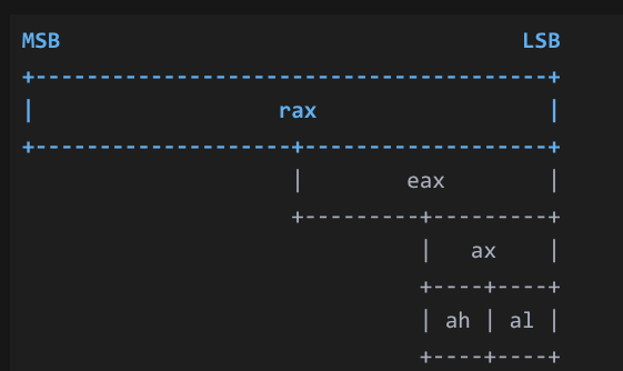 x86的寄存器结构图,x86的好处在于通过名字我们可以轻松控制寄存器中不同长度的数字从64bit到32bit到16bit再到8bit