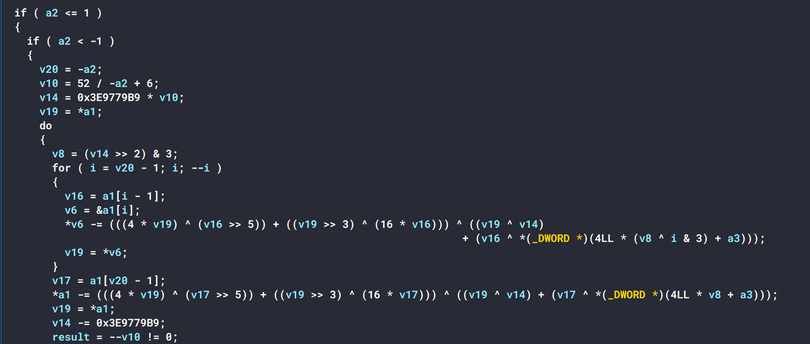#define MX (((z>>5^y<<2) + (y>>3^z<<4)) ^ ((sum^y) + (key[(p&3)^e] ^ z)))
