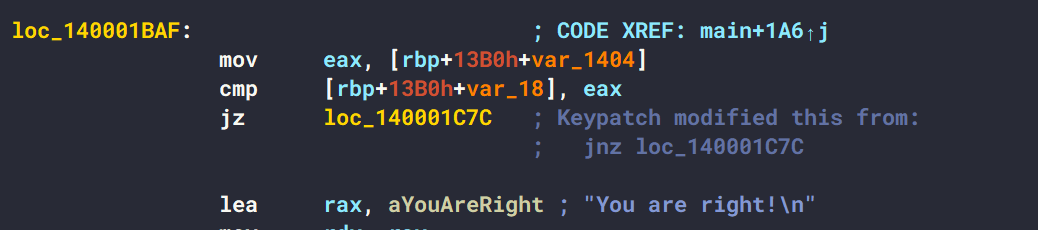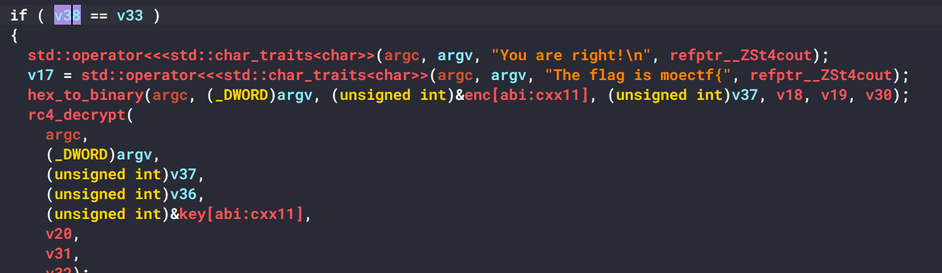 如果我们输入的数字=v33,那么会直接输出flag,那么反过来patch一下就可以输错也得到flag