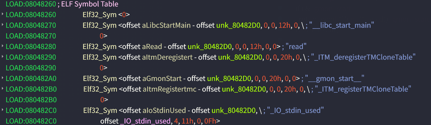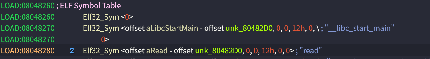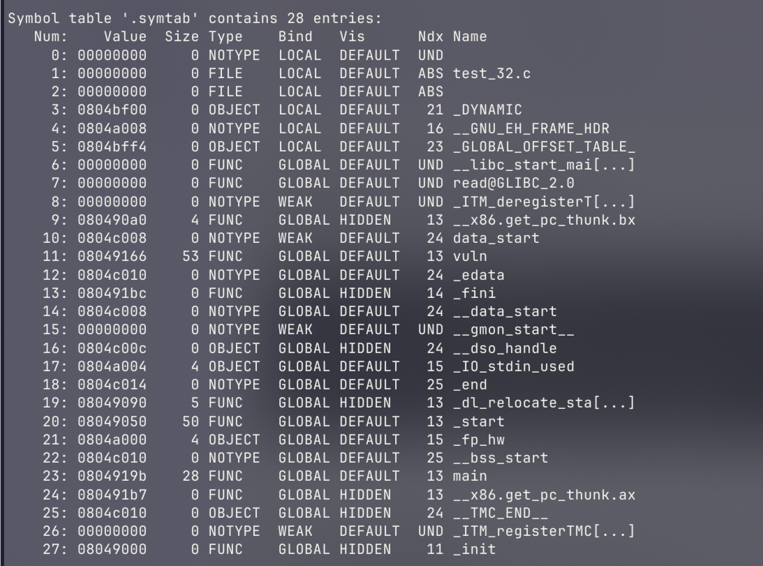 typedefstruct{Elf32_Wordst_name;/* Symbol name (string tbl index) */Elf32_Addrst_value;/* Symbol value */Elf32_Wordst_size;/* Symbol size */unsignedcharst_info;/* Symbol type and binding */unsignedcharst_other;/* Symbol visibility */Elf32_Sectionst_shndx;/* Section index */}Elf32_Sym;