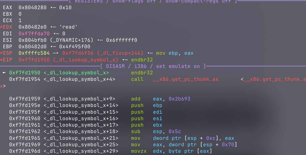 constElfW(Sym)*refsym=sym;void*constrel_addr=(void*)(l->l_addr+reloc->r_offset);lookup_tresult;DL_FIXUP_VALUE_TYPEvalue;/* Sanity check that we're really looking at a PLT relocation. */assert(ELFW(R_TYPE)(reloc->r_info)==ELF_MACHINE_JMP_SLOT);//这里还会检查reloc->r_info的最低位是不是R_386_JMUP_SLOT=7,即重定位标志