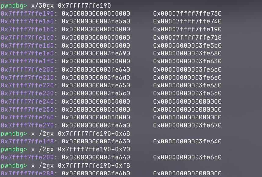 _dl_fixup(structlink_map*l,ElfW(Word)reloc_arg)//第一个参数link_map,也就是got[1]{//获取link_map中存放DT_SYMTAB的地址constElfW(Sym)*constsymtab=(constvoid*)D_PTR(l,l_info[DT_SYMTAB]);//获取link_map中存放DT_STRTAB的地址constchar*strtab=(constvoid*)D_PTR(l,l_info[DT_STRTAB]);//reloc_offset就是reloc_arg,获取重定位表项中对应函数的结构体constPLTREL*constreloc=(constvoid*)(D_PTR(l,l_info[DT_JMPREL])+reloc_offset);//根据重定位结构体的r_info得到symtab表中对应的结构体constElfW(Sym)*sym=&symtab[ELFW(R_SYM)(reloc->r_info)];void*constrel_addr=(void*)(l->l_addr+reloc->r_offset);lookup_tresult;DL_FIXUP_VALUE_TYPEvalue;/*Sanitycheckthatwe're really looking at a PLT relocation. */assert(ELFW(R_TYPE)(reloc->r_info)==ELF_MACHINE_JMP_SLOT);//检查r_info的最低位是不是7/*Lookupthetargetsymbol.Ifthenormallookuprulesarenotuseddon't look in the global scope. */if(__builtin_expect(ELFW(ST_VISIBILITY)(sym->st_other),0)==0)//这里是一层检测,检查sym结构体中的st_other是否为0,正常情况下为0,执行下面代码{conststructr_found_version*version=NULL;//这里也是一层检测,检查link_map中的DT_VERSYM是否为NULL,正常情况下不为NULL,执行下面代码if(l->l_info[VERSYMIDX(DT_VERSYM)]!=NULL){//到了这里就是64位下报错的位置,在计算版本号时,vernum[ELFW(R_SYM)(reloc->r_info)]&0x7fff的过程中,由于我们一般伪造的symtab位于bss段//就导致在64位下reloc->r_info比较大,故程序会发生错误。所以要使程序不发生错误,自然想到的办法就是不执行这里的代码,分析上面的代码我们就可以得到两种手段//第一种手段就是使上一行的if不成立,也就是设置link_map中的DT_VERSYM为NULL,那我们就要泄露出link_map的地址,而如果我们能泄露地址,根本用不着ret2dlresolve。//第二种手段就是使最外层的if不成立,也就是使sym结构体中的st_other不为0,直接跳到后面的else语句执行。constElfW(Half)*vernum=(constvoid*)D_PTR(l,l_info[VERSYMIDX(DT_VERSYM)]);ElfW(Half)ndx=vernum[ELFW(R_SYM)(reloc->r_info)]&0x7fff;version=&l->l_versions[ndx];if(version->hash==0)version=NULL;}/*Weneedtokeepthescopearoundsodosomelocking.Thisisnotnecessaryforobjectswhichcannotbeunloadedorwhenwearenotusinganythreads(yet).*/intflags=DL_LOOKUP_ADD_DEPENDENCY;if(!RTLD_SINGLE_THREAD_P){THREAD_GSCOPE_SET_FLAG();flags|=DL_LOOKUP_GSCOPE_LOCK;}RTLD_ENABLE_FOREIGN_CALL;//在32位情况下,上面代码运行中不会出错,就会走到这里,这里通过strtab+sym->st_name找到符号表字符串,result为libc基地址result=_dl_lookup_symbol_x(strtab+sym->st_name,l,&sym,l->l_scope,version,ELF_RTYPE_CLASS_PLT,flags,NULL);/*Wearedonewiththeglobalscope.*/if(!RTLD_SINGLE_THREAD_P)THREAD_GSCOPE_RESET_FLAG();RTLD_FINALIZE_FOREIGN_CALL;/*Currentlyresultcontainsthebaseloadaddress(orlinkmap)oftheobjectthatdefinessym.Nowaddinthesymboloffset.*///同样,如果正常执行,接下来会来到这里,得到value的值,为libc基址加上要解析函数的偏移地址,也即实际地址,即result+st_valuevalue=DL_FIXUP_MAKE_VALUE(result,sym?(LOOKUP_VALUE_ADDRESS(result)+sym->st_value):0);}else{//这里就是64位下利用的关键,在最上面的if不成立后,就会来到这里,这里value的计算方式是l->l_addr+st_value,我们的目的是使value为我们所需要的函数的地址,所以就得控制两个参数,l_addr和st_value/*Wealreadyfoundthesymbol.Themodule(andthereforeitsloadaddress)isalsoknown.*/value=DL_FIXUP_MAKE_VALUE(l,l->l_addr+sym->st_value);result=l;}/*Andnowperhapstherelocationaddend.*/value=elf_machine_plt_value(l,reloc,value);if(sym!=NULL&&__builtin_expect(ELFW(ST_TYPE)(sym->st_info)==STT_GNU_IFUNC,0))value=elf_ifunc_invoke(DL_FIXUP_VALUE_ADDR(value));/*Finally,fixupthepltitself.*/if(__glibc_unlikely(GLRO(dl_bind_not)))returnvalue;//最后把value写入相应的GOT表条目中returnelf_machine_fixup_plt(l,result,reloc,rel_addr,value);}