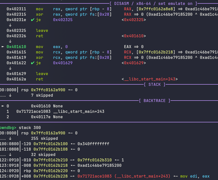 而pop部分始终会执行–的操作,即使检查无法通过也不会报错,这就导致可以正常返回,从而覆盖到栈上的信息,而在进入函数之前刚好就是0,所以我们直接输入+的话,就会如下图