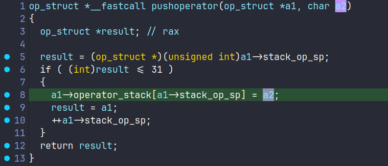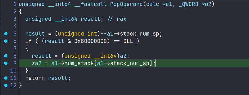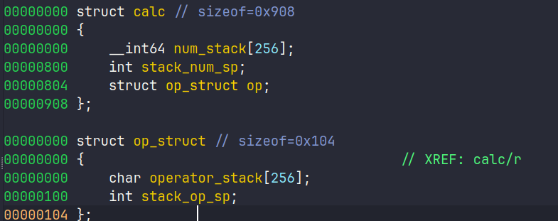 如果输入一个+的情况下会因为多清理一次栈而导致变为0从而指向0-8,这时候需要回去看具体的逻辑才可以。难受的是符号全剥去了,不过好在结构体还比较好逆,实际上程序模拟实现了两个栈,分别装载操作数和操作符