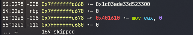 按照逻辑,直到遇到之前的++我们的while都不会退出,伴随着(我们的地址进入栈中,但注意此时还是没有覆盖到返回地址的,准备好之后最后再执行到ret++的部分,此时不就实现了-1开始的链条覆盖了吗?