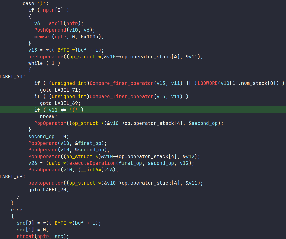 遇到)的时候,实际上陷入到了while(1)循环当中,v11由上一次的Peek得到,若为(则会继续走pop分支