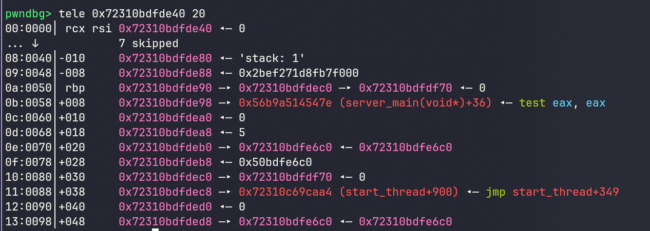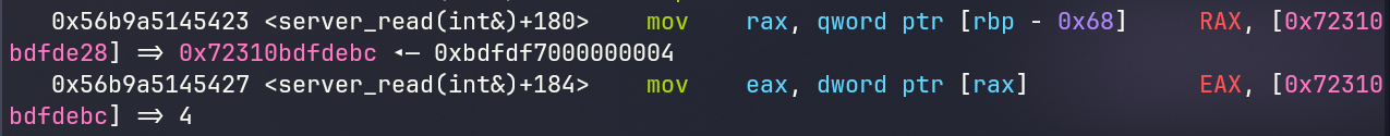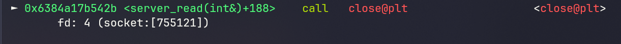 server_read有栈溢出并且会不断被调用,但是就像上一题,这一题可没有MSG_WAITALL来让我们使用中断信号leak信息了