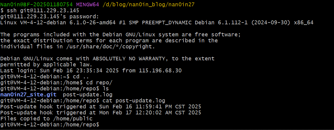 git clone git@服务器IP地址:/home/repo/nan0in27_site.git